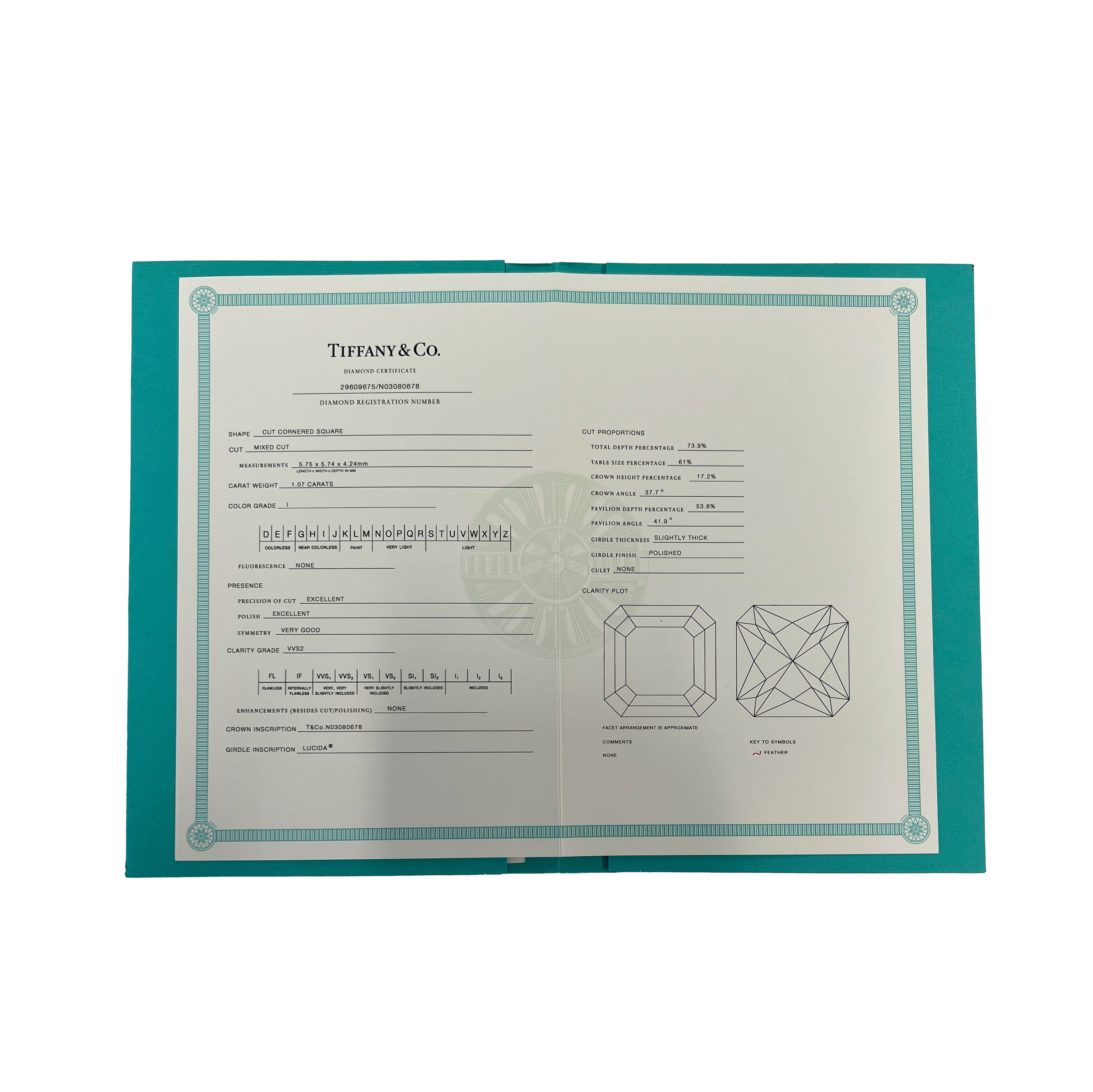Tiffany & Co. patented the Lucida diamond cut, a mixed-cut style with intense depth. The Lucida diamond ring is reminiscent of the ‘90s, when the ring was first introduced. Retails for 14250 USD. In excellent condition and recently polished. Ring size is 4.5. Comes with Valuation Report;Tiffany Diamond Certificate; (Out of stock)