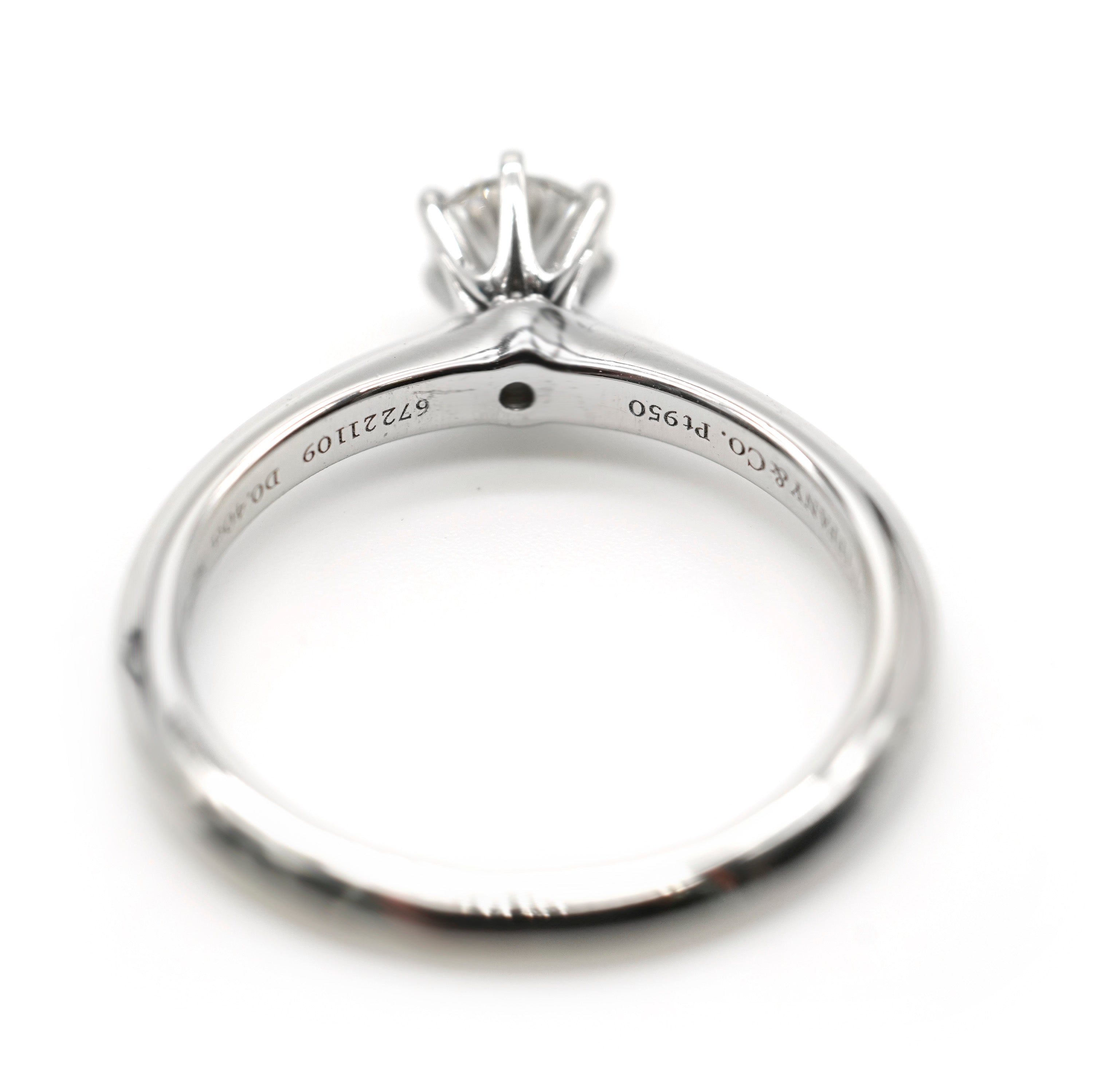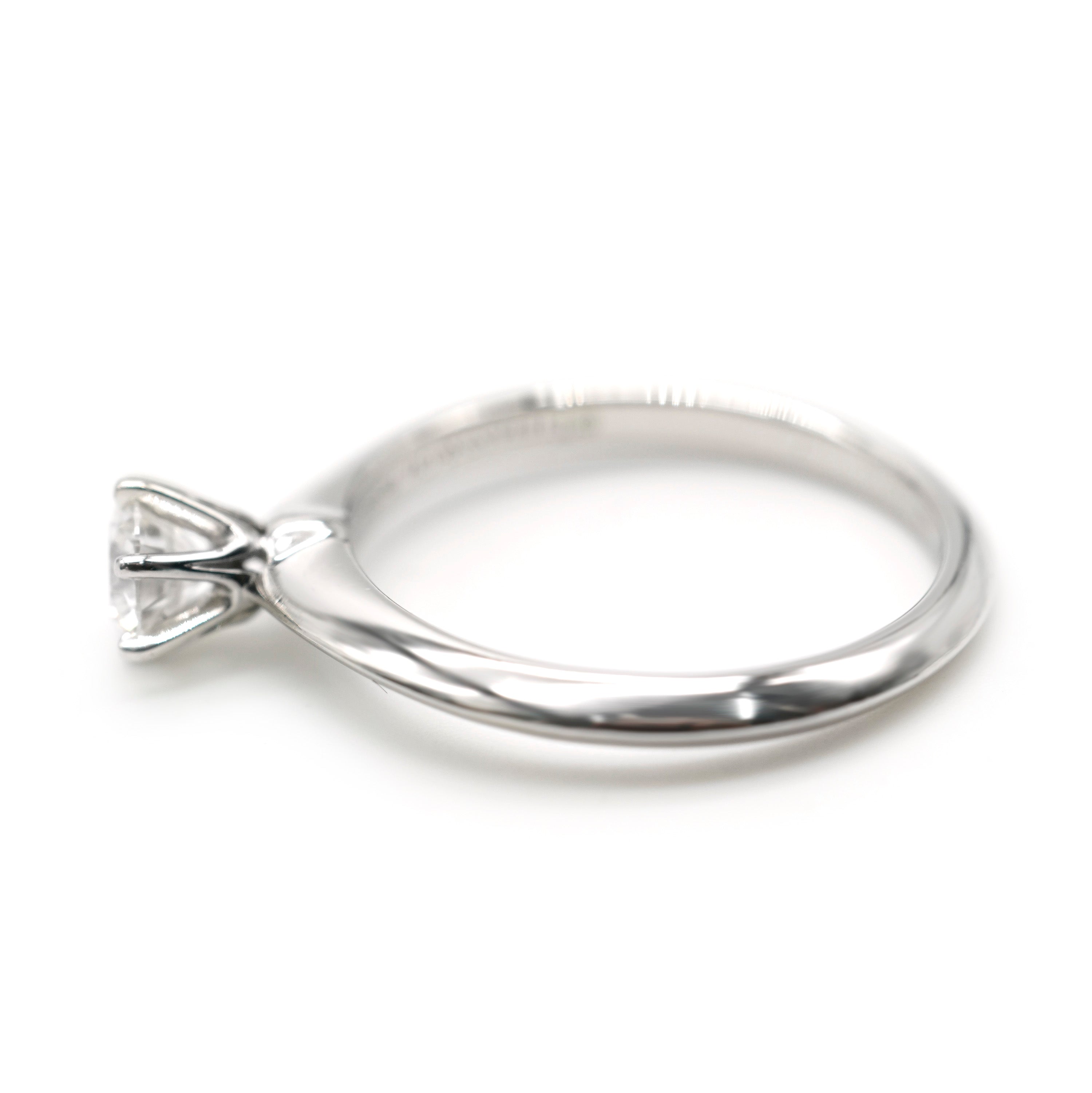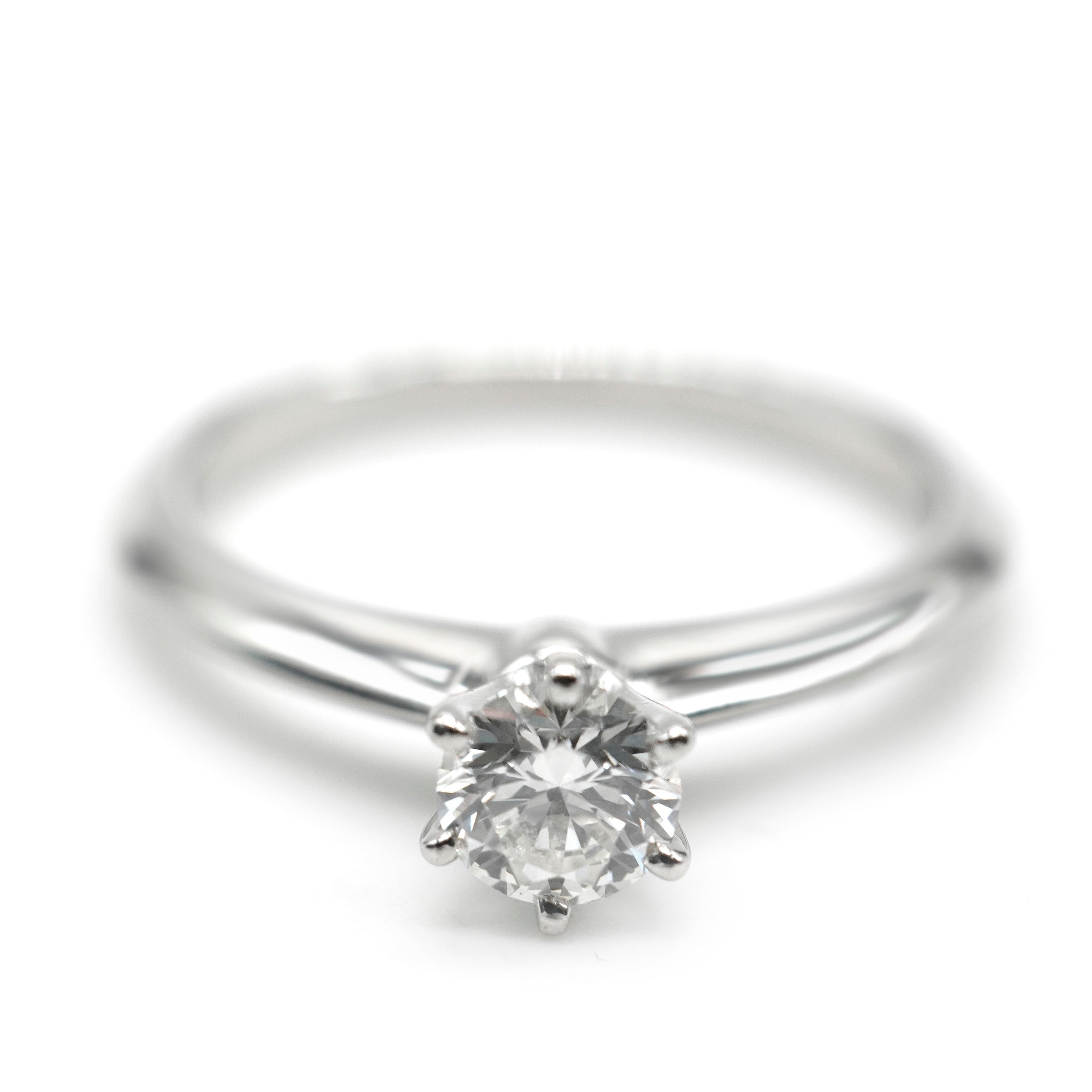 The classic engagement ring. Tiffany & Co. introduced its first solitaire engagement ring in 1886. Featuring a single center stone, the solitaire engagement ring is typically set on a plain band, however some styles may feature a pavé band. Retails for 4020 USD. In excellent condition and recently polished. Ring size is 6. Comes with Box;Tiffany Diamond Certificate; (Out of stock)