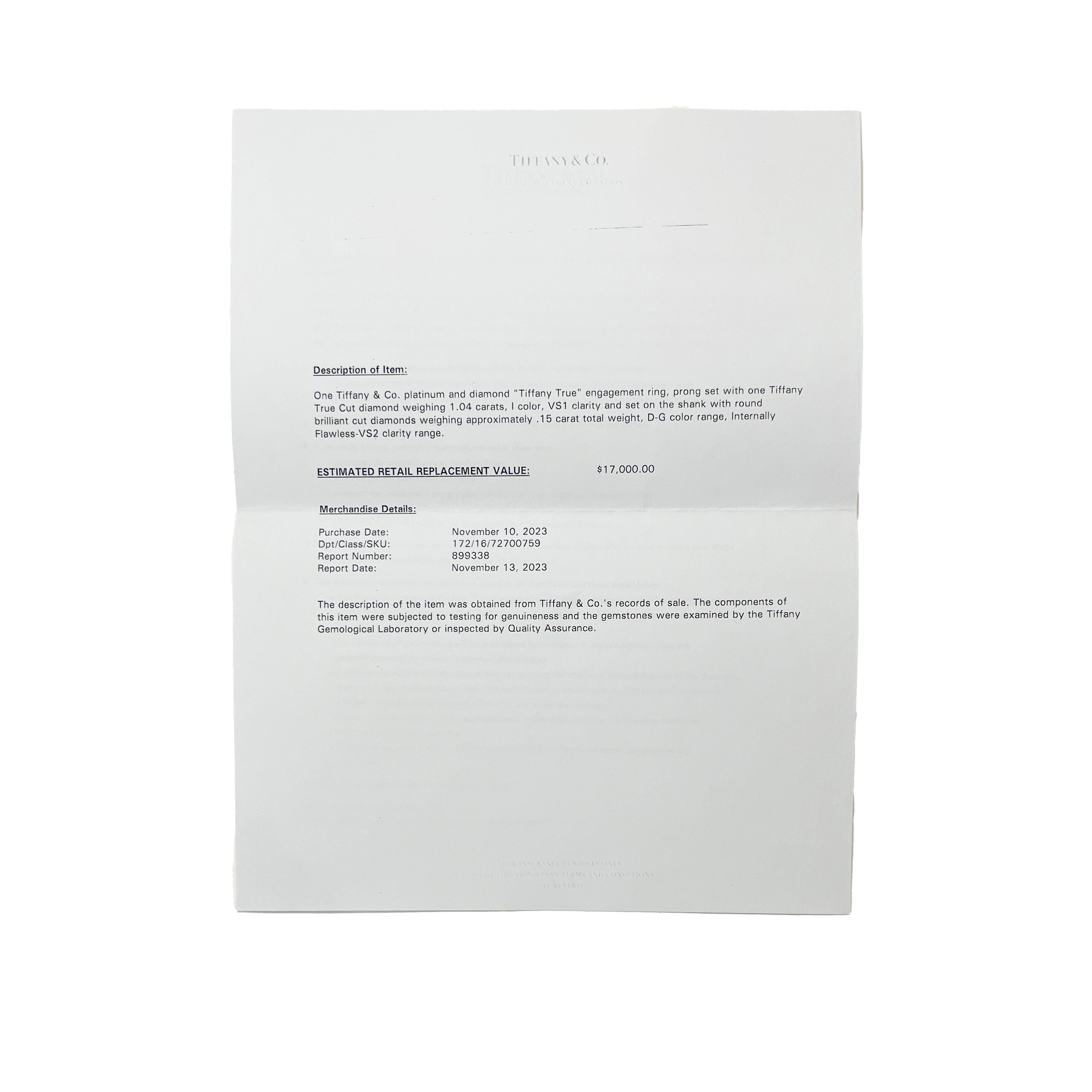 Tiffany True Engagement Ring in Platinum I VS1 1.19 CTW